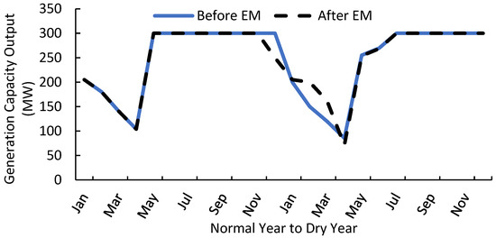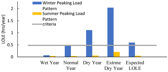 A winter peaking load pattern shows a negative correlation with the generation capability of the hydro generation output as depicted in Figure 10. The system peak load occurs during the dry months (Dec–Jan) when the generating units have derated outputs, which increases the loss of load probability. On the other hand, the system off-peak load occurs during the wet months (May–Jul) when the generation units have rated capacity output which is not necessary to meet the light load demand.