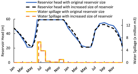 The size or capacity of the reservoir is one of the main limitations in energy management, as discussed in Section 3.1. With current reservoir size restraints, a large amount of water in the wet season is wasted as spillage. The reliability can be enhanced by increasing the reservoir size to avoid water spillage. It can store and manage additional energy from year to year as needed.