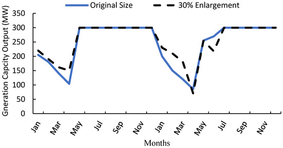 Figure 8 shows a reservoir head and water spillage for 300 MW storage type hydro plant. A study was carried out by increasing the reservoir size by 30%. With the increased size, it takes a longer time to fill the reservoir to its maximum head in July as shown in Figure 8. More water is saved during the wet season due to reduced spillage in July, and the stored water is carried over from the current year to the upcoming year. The saved water is distributed in the dry months from January to March of the following dry year where there is a severe shortage of water. At the end of April, the saved water is all used up and the head value reaches its lowest limit. The corresponding MW capacity output of the 300 MW hydro unit after the increase in reservoir size is shown in Figure 9. Starting with the same head, the reservoir with 30% increased size stores more water in the reservoir and yields more capacity output in the energy-limited months than the original size reservoir from January to April in the current year. With the increased reservoir size, the capacity output in the dry months from January to April of the following dry year will increase significantly due to additional water stored from the current year to use in the upcoming year.