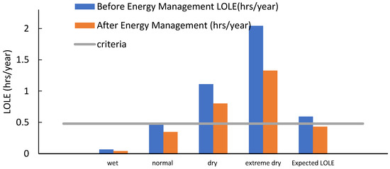 The proposed methodology of water management for reliability enhancement was applied to the modified RTS system to investigate the reliability impacts. Figure 11 shows the LOLE for the four hydrological condition years with and without implementing the energy management strategy. Figure 11 also shows the expected LOLE for the upcoming year obtained by multiplying the LOLE for each of the four hydrological conditions by the probability of its occurrence. The expected LOLE is 0.48 h/year. This is equivalent to LOLE of 0.1 days/year, which is the widely used reliability planning criterion [22] in major power utilities.
