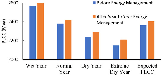 The peak load carrying capacity (PLCC) [17] of a system is the peak load that the system can carry without violating its reliability planning criterion. The PLCCs of the system are shown in Figure 12 for the four hydrological conditions assuming a planning criterion of LOLE = 0.48 h/year. The system can carry a higher peak load after applying the year to year energy management in all hydrological conditions.
