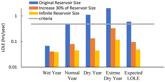 Another study was carried out to investigate the impact of reservoir capacity on the system reliability in the different hydrological years with year to year energy management. Three different reservoir sizes were considered: (1) the original size, (2) a 30% increase in reservoir volume, and (3) a reservoir with infinite volume. The results are shown in Figure 13.