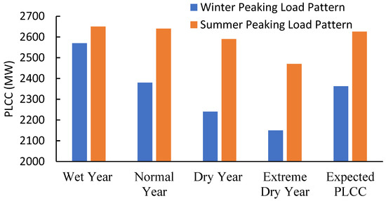 Figure 14 shows the PLCC of the system considering the impact of the three reservoir sizes and the four hydrological condition years. The PLCC increased for all hydrological condition years with 30% increase of reservoir size and infinite reservoir size. The PLCC increased significantly in a dry year from 2240 MW to 2520 MW for 30% increase of reservoir, and in an extreme dry year from 2150 MW to 2420 MW. With infinite reservoir size, the PLCC increased to 2630 MW in a dry year and 2540 MW in extreme dry year.