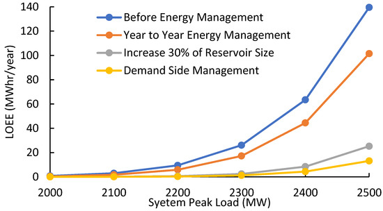 Variation in expected loss of energy expectation (LOEE) with the system peak load using different reliability enhancement strategies.