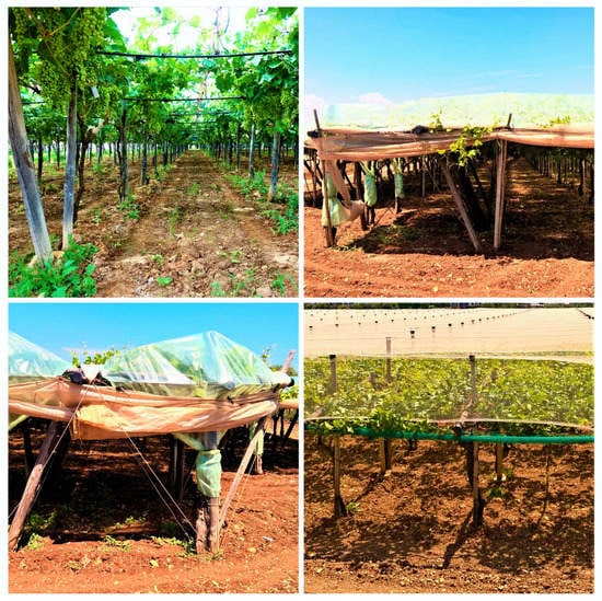 - Rana, G.; Katerji, N.; Introna, M.; Hammami, A. Microclimate and plant water relationship of the “overhead” table grape vineyard managed with three different covering techniques. Sci. Hortic. 2004, 102, 105–120. [Google Scholar] [CrossRef]