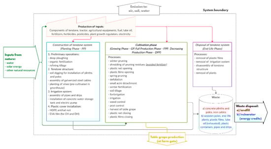 The processes and materials used for the construction of the tendone system (Table 1) were considered as part of the system boundaries (Figure 3). The soil preparation consists of a deep ploughing, organic fertilization, and refining tillage. These operations, evaluated per hectare of land, are carried out through a tractor that operates with the use of diesel and lube oil. All the agricultural machines, consumption, maintenance, and production energy were evaluated and preset in the LCA software used (Gabi ver. 8) [60]. The housing of the tractor is a shed.