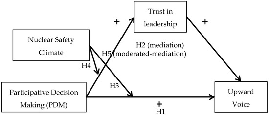 This study addresses how to build a supportive upward voice environment, which means taking into account both the supervisor–subordinate relationship and the organizational context in which this relationship takes place all together. Previous research adopting such a comprehensive approach is scarce [18]. This study postulates that nuclear safety climate will moderate both the direct effect of participative decision making (PDM) on upward voice and its indirect effect via trust in leadership (See Figure 1). Based on safety climate theory (e.g., [20,21]), this study advocates that safety climate provides an interpretation framework about valued and adaptive behaviors that influence the development of a supportive upward voice environment. To our knowledge, none of these relationships have been previously explored.
