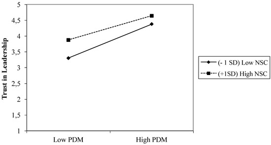 Plot of interaction between participative decision making (PDM) and nuclear safety climate (NSC) in predicting trust in leadership.