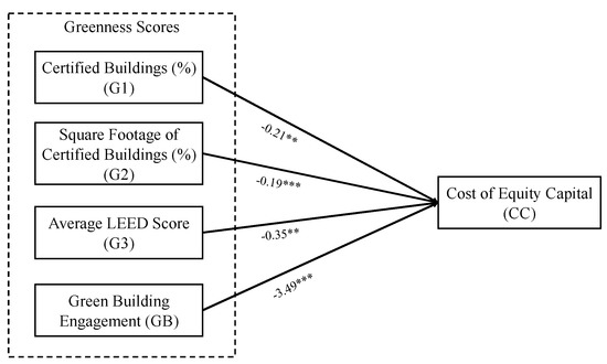 Table 3 presents the panel data regression results of examining the relationship between green building implementation and the cost of equity capital. The cost of equity capital is regressed on the four measures of greenness separately, controlling for fixed effects. Figure 1 presents the coefficient estimates of the greenness scores from the cost of equity capital regression. In all the estimations, it is documented that the greenness of the REITs is significantly and negatively related to the cost of equity capital, supporting hypothesis 1. In particular, higher levels of G1, G2, and G3 significantly reduce the cost of equity capital. For G1, it can be seen that the cost of equity capital will decrease by 0.21% when a REIT increases the percentage of its buildings that are certified by one percent. The same increase in the percentage of building area that is certified will reduce the cost of equity capital by about 0.19%. This shows that increasing either the percentage of certified buildings or the percentage area of certified buildings will result in a similar decrease in the cost of equity capital. When REITs have a higher level of LEED green building certification, this will lead to a decrease of 0.35% in the cost of equity capital. The coefficient on GB is also negatively significant. The value of 3.49 means that, when REITs gain LEED green building certification, it could lead to a decrease of 3.49% in the cost of equity, compared to if they have no certification.