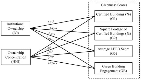 Table 4 presents the results of examining the effects of corporate governance practice on green building implementation intensity. We regress the greenness scores on the ownership variables (institutional ownership and ownership concentration), controlling for fixed effects. Figure 2 presents the coefficient estimates from the green building implementation intensity regression. All estimation results show that the ownership variables have a positively significant impact on the greenness scores, as expected. The results indicate that both institutional ownership and ownership concentration support LEED green building implementation, which supports hypothesis 2.