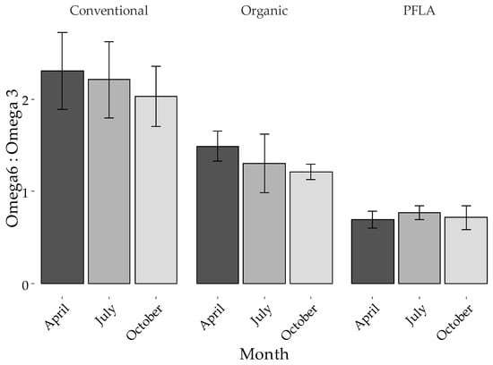 Seasonal variation in milk composition is expected due to the difference in feeding throughout the year on most systems (often cows are outdoors grazing during the summer and indoors on silage or hay diets during winter) []. Different patterns in the ratio of n-6/n-3—conventional and organic milk follows the expected trend of a high ratio of n-6/n-3 in April (when high-yielding cows might still be fed conserved forages with grains or cereal by-products) and a decrease in the ratio across July and October, when diets are likely to have increasing proportions of fresh forage from grazing (Figure 1). In both the conventional and organic milk, n-3 concentrations gradually increased across the three sampling dates, whilst n-6 either remained the same (conventional) or decreased (organic), which is a similar pattern reported by Butler et al. [] and Kliem et al. [] (only conventional) in seasonal retail milk comparison studies. However, the PFLA milk did not follow this pattern; both n-3 (higher in PFLA than the other milks) and n-6 (lower than the other milks) increase incrementally from July to October, resulting in the n-6/n-3 ratio remaining relatively constant. PFLA farms were spread across the southern UK, with a wide range of herd sizes, breeds, sward types and management, but the main constant between farmers was their feeding policy. PFLA does not feed any grains, only forage, suggesting the continuity in forage-based feeding creates a more consistent composition, especially in the ratio of n-6/n-3, which has a stronger effect than location or other aspects of management (e.g., breed). Although the supermarket milk samples may have come from a smaller geographic area, they had a wide variation, partially attributed to the unknown of how many farms contributed to each sample. Despite this inherent variability, likelihood is high (especially in conventional systems) that cows come from a similar genetic lineage, suggesting that management, including feeding, is diverse in farms supplying the different supermarkets.