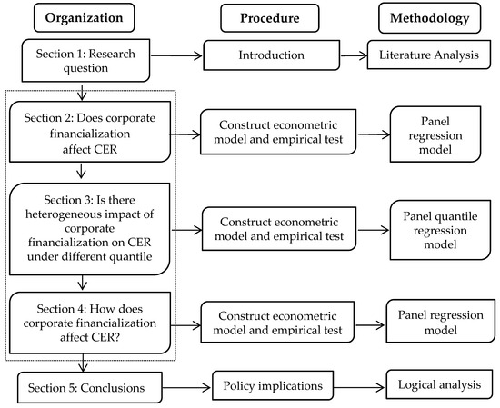 The paper is organized as follows (see Figure 1 for the logical framework). Section 2 presents the examination of the impact of corporate financialization on CER, the purpose of which is to investigate the impact using an econometric model based on the sample data. Section 3 presents the evaluation of the heterogeneity related to the impact of corporate financialization on CER. When taking CER into consideration, we think that corporate culture is diverse, and accordingly the awareness of corporate brand differs, therefore, there would be heterogeneity in the impact of corporate financialization on CER. Section 4 discusses the mechanism of the influence of corporate financialization on CER. Based on the discussion in the sub-samples, we look at whether the impact of corporate financialization on CER would be heterogeneity, through which we will find out the moderate variable in different sub-samples.