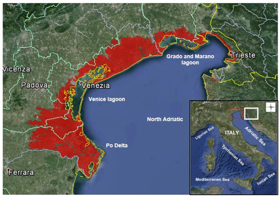 The study area considered for the application of the MRA methodology (Figure 1) comprises the Italian coast of the North Adriatic region from the national border between Italy and Slovenia to the mouth of the southern tributary of the Po Delta system (i.e., Po di Goro). It includes the coast of the Veneto and Friuli Venezia Giulia Regions, for an overall length of about 286 km along the Adriatic Sea [37]. It covers the territory below the 2 m elevation contour line, for a total surface of 3531 km2. From a morphological point of view, the coast includes a variety of coastal landforms spanning from the low-lying sedimentary coasts of the Po River Plain to the rocky and higher shorelines of Trieste, interrupted by several river mouths and lagoons. Moreover, it hosts several environmental and socioeconomic systems highly vulnerable to climate change (e.g., the Po River Delta, the historical city of Venice, wetlands, and habitats of international importance). Some examples of climate-related impacts affecting the region are the intensification of extreme flood events in the city of Venice [38,39], which have been particularly damaging in autumn 2018 and 2019 (www.comune.venezia.it). Moreover, the heavy rainfall events and the related pluvial floods in urban areas [40] as well as the risk of water quality deterioration and loss of ecosystem services in coastal [41] and marine waters [42] are an increasing concern for the region. Despite the widespread presence of artificial protections (e.g., seawalls, breakwaters, submerged defenses, and river banks in the Po River Delta), the possible effects of coastal flooding and erosion remain a big issue for coastal zone management [43,44,45] and are expected to increase in the future due to climate change [46,47]. For these reasons, the Italian Ministry of the Environment recognized the North Adriatic coast as a fragile region, highly vulnerable to climate change and sea-level rise impacts [48]. Even if several measures such as the mobile barriers designed to protect Venice from high tides (i.e., the MOSE project that should be completed by the end of 2021: www.mosevenezia.eu) and other types of natural and semi-natural coastal protections (e.g., beach and sandbanks nourishment, dune restoration, and creation of new dunes with the use of natural vegetation) [49,50,51,52,53,54] are already in place to protect the study area, sustainable and integrated coastal planning should be reinforced to consider the impacts that could amplify one another across the land-sea interface [55].