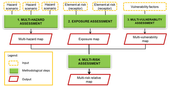 The main aim of the multi-risk assessment is a relative evaluation of the cumulative risks affecting the study area, taking into account correlation and probabilities of the analyzed hazards, the presence and localization of multiple elements at risk, and their vulnerability to the different types of hazards [76].