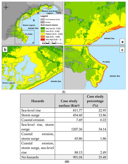 In this application, a team of environmental risk experts represented by the authors of this paper performed the assignation of the influence weights (Table S5). The weighting procedure was performed considering the recent scientific evidences about storm surge flooding, sea level rise, and coastal erosion risks in the North Adriatic region [35,36,58]. Qualitative and individual evaluations involved in the process can limit the validity and reproducibility of the results. It is worth noting that the common scale adopted for the assignation of weights to hazard interactions removes a certain amount of subjectivity, adding credibility to the multi-hazard analysis (Table S3).