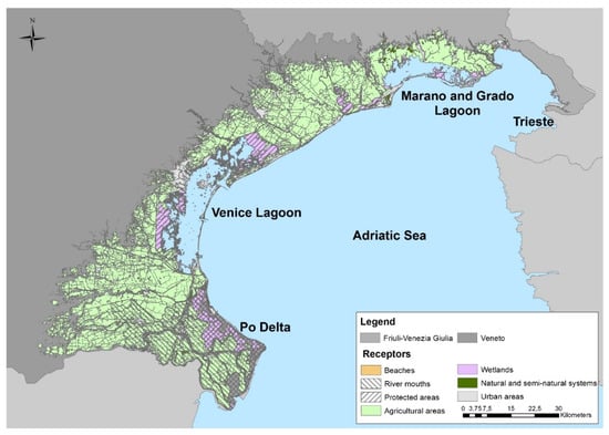 According to the main characteristics and vulnerabilities of the territory, the scale of analysis and the available dataset (Section 2), the exposure assessment in the North Adriatic coast was focused on environmental receptors including beaches, river mouths, wetlands, protected areas, natural/semi-natural systems, and agricultural area. Relevant socioeconomic elements such as infrastructure and population were also considered in the analysis, selected as potential risk hotspots in urban areas.