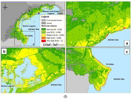 As described in the next subsections, each step of the MRA requires the management of heterogeneous input data with different units of measures (e.g., climate projections, hydrodynamic simulations, publicly available land use, and geo-biophysical data) that are first geo-referenced and converted into homogeneous grid maps (raster data), and then normalized to ensure comparability across different spatial layers and their aggregation with MCDA. According to an acknowledged practice in natural hazard and environmental risk assessment [73], our MRA integrates the use of expert knowledge when a quantitative estimate of hazards or vulnerabilities is not achievable due to lack of resources or data. The experts involved in the MRA testing in the North Adriatic Coast are mainly the authors of the paper, representing a multi-disciplinary team of environmental scientists, geographers, and natural hazard and climate change risk experts, as well as experts with extensive experience in the application of Multi-Criteria Decision Analysis (MCDA). The experts’ opinions were first based on the survey of scientific literature and historical data on coastal erosion and flood hazard risk assessment on the case study area, and then complemented by discussions with other experts in relevant fields such as hydrodynamic and climate modelers, as well as local stakeholders and territorial experts (mainly civil engineers) from regional/local coastal zone management authorities (Table S1) who joined several workshops in the framework of national and European projects where the intermediate results of the analysis were presented and discussed (e.g., FP7 CLIM-RUN and PEGASO projects [74,75]). The output of the analysis (including multi-risk maps and statistics presented in Section 4) could support the definition of comprehensive climate adaptation and disaster risk management strategies.