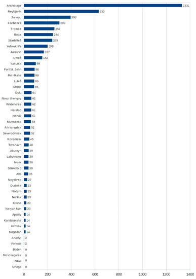 Perhaps the most distinguishing geographic feature of Arctic cities is their relative remoteness. Arctic regions are located far from markets and centers of commerce [26]. Geographic isolation separates producers from consumers, which increases transportation costs. Higher transport expenditures increase the cost of business, reducing economic opportunities while raising the cost of living. Only one Arctic region, Iceland, is a nation-state. With that exception, all Arctic cities are geographically remote from centers of political power. Even in the age of globalization and the internet, the Arctic remains culturally distant, often portrayed as the exotic “other” in popular culture [27,28].