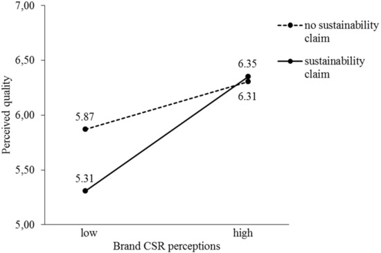 Results revealed a significant negative main effect of a sustainability claim (b = −1.61, p < 0.001), indicating in line with hypothesis 1 that the perceived quality of the innovative product is impaired when adding a sustainability label. We also find a non-hypothesized significant positive main effect of perceived brand CSR (b = 0.19, p < 0.01), supporting prior findings that CSR is positively related to brand attitudes [19]. Importantly and as expected, these main effects were qualified by a positive sustainability claim × perceived brand CSR interaction (b = 0.26, p < 0.01), indicating that a new product introduced by a CSR brand is less likely to encounter such skepticism, which is in line with hypothesis 2. Furthermore, results revealed a significant indirect effect of the sustainability claim on perceived quality via perceived brand CSR (b = 0.07; SE = 0.03, 95% CI [0.02, 0.14]).