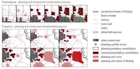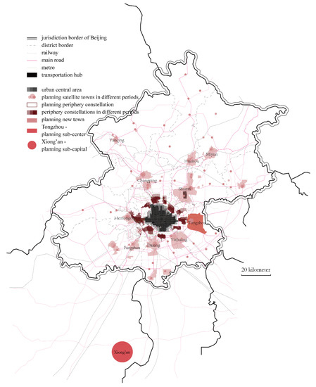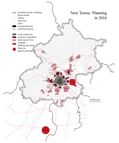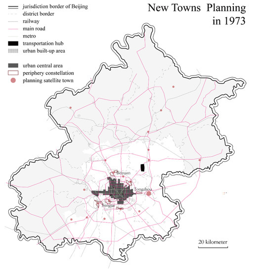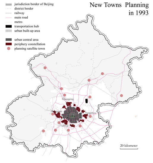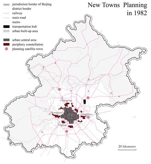- Wang, P. From Satellite Town to New Town: Jumping out of the Concentric Population and Industry. Beijing City Plan. Constr. Rev. 2005, 2, 139–143. [Google Scholar]