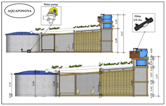 The Aquaponova system—as shown in Figure 1—contains 12 PVC pipes and 2 water tanks of 1000 L. The oxygenation of the water in the tanks is partly done by the water recirculation itself. The water that goes down the PVC pipes falls back into the fish tank from a height of about 30 to 40 cm, causing some oxygenation. The other part of the oxygenation is done by an aquarium oxygenation pump (powered by 12V). Each PVC pipe contains 14 holes to plant the vegetables. The space below the pipes is enclosed and used as a chicken coop (see Figure 2). To protect the vegetables, fish and chickens from the sun, the system is covered with a shade screen, preferably a plastic mesh netted cloth. On top of the construction is a solar panel that produces energy to pump the recirculating water. The scale of the system makes it possible to obtain a production capable of meeting the needs of a family of up to five people with fish, eggs and vegetables (see Figure 3). In addition, there is a surplus which can be sold on the market to generate income. The capital and operational expenditure are shown in Table 1.