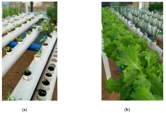 (a) shows the growing vegetables in an aquaponic system and (b) shows lettuce ready to be harvested.