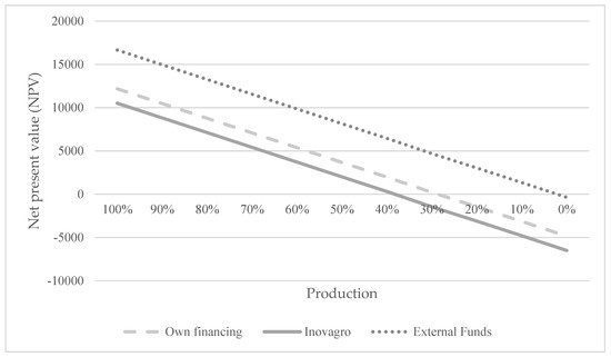 In the previous scenarios the assumption was made that the Aquaponova system always produces the same amount of food. This paper considers this situation as the maximum production or production at 100%. This means that during the project period of ten years the system would always work impeccably. In reality, there will be days that the system does not work, there will be harvests that fail, fish that die, and so on. Therefore, it is necessary to estimate the NPV in case of decreasing food production from full production (100%) to zero production (0%) (see Figure 4).