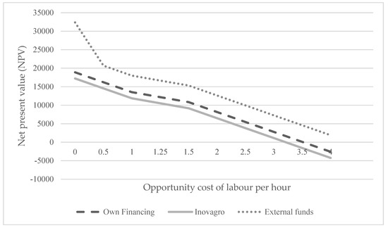 This is an interesting—and more economically correct—scenario than the previous one. In this scenario the opportunity cost of labour and the revenue from consuming home-grown food are considered in the CBA. The first difference is that the opportunity cost of labour is taken into account, although it is possible to combine a paid job with managing the Aquaponova system. Due to the high unemployment and poverty rate in the region, the opportunity cost of labour per hour is based on the minimum hourly wage of USD1.25 (R$4.54) [25]. The second difference is that the home-grown food consumed by the beneficiaries is valued 5% more than the food sold on the market. To evaluate the system, three different financial options will be commented on and are summarized in Table 3.