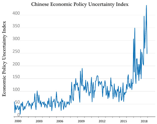 Economic policy uncertainty (EPU). For the measurement of economic policy uncertainty, the existing literature mainly uses indirect methods, such as the uncertainty of specific fiscal or monetary policy, the fluctuation of relevant indicators at the enterprise level or changes in government officials. We use the economic policy uncertainty index constructed by Baker et al. [2] to directly measure this factor. Chinese economic policy uncertainty index in 2000–2018 is shown in Figure 1. Calculated from data from the South China Morning Post, the index reports the uncertainty of China’s economic policy as a percentage of the total number of articles in the current month. This method of measuring economic policy uncertainty based on a news index has been widely used by researchers due to its high degree of fit with the trend of uncertain events over time. For consistency with the quarterly data structure of enterprises, the original monthly data of the EPU index are aggregated to obtain a quarterly EPU index. To match the meaning of the other two indicators, first-order difference processing is carried out to obtain the EPU index used in this paper.