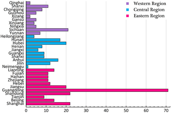 Using the division method of the National Bureau of Statistics of China (according to the geographical location and economic development level) in combination with the division method used in existing research, this paper divides China into regions as follows: 11 coastal provinces, including Shanghai, Beijing, Tianjin, Shandong, Guangdong, Jiangsu, Hebei, Zhejiang, Hainan, Fujian and Liaoning, comprise the eastern region; 10 provinces, including Inner Mongolia, Jilin, Anhui, Shanxi, Guangxi, Jiangxi, Henan, Hubei, Hunan and Heilongjiang, comprise the central region; and 10 provinces, including Yunnan, Sichuan, Ningxia, Xinjiang, Gansu, Tibet, Guizhou, Chongqing, Shaanxi and Qinghai, comprise the western region. Due to data availability, this paper does not consider Hong Kong, Macao, or Taiwan.