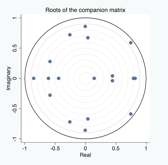 Before the regression analysis of the PVAR model, it is necessary to determine the optimal lag order of the model. Compared with a traditional VAR model, the PVAR model introduced by panel analysis has a lower requirement for data length. As long as T ≥ m + 3 (T is the length of the time series, and m is the order of the lag), the parameters of the equation can be estimated; if T ≥ 2m + 2, the parameter of the lag term can be estimated in the steady state. For the PVAR model, the higher the lag order is, the stronger the interpretation ability of the model but the more the order of delay will affect the degrees of freedom. Therefore, it is necessary to select an appropriate lag order. In this paper, the optimal lag order of the model is determined according to the minimization principles of the modified Akaike information criterion (MAIC), the modified Bayesian information criterion (MBIC), and the modified Hannan–Quinn information criterion (MQIC). As shown in Table 4, when the PVAR model lag is 6th-order, the three major information criteria are small at the same time, so the optimal lag order for determining the full sample is 6th-order.