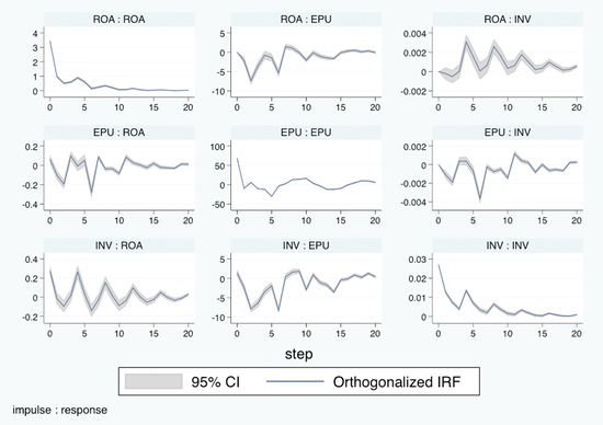 In Table 6, from the perspective of the variables themselves, the impact of 1–6 periods of EPU lags on the current period is significant at the level of 1%. Except for the positive impact of the variables with a 2-period lag on the current-period EPU, where the coefficient is relatively small, the other factors have a negative impact, with the coefficient of the lag period of 5 being the highest. The results show that economic policy uncertainty in an early stage has an important impact on economic policy uncertainty in the current period. The investment level INV with lags of 1–4 periods has a positive impact on the current investment at a significant level, while the investment variable with lags of 5–6 periods has a significant negative impact on the current investment INV. This indicates that the investment activities in the previous 1–4 periods, that is, in the past year, have a positive impact on the current investment, while the investment activities in the prior 5–6 periods, that is, more than 1 year ago, have a negative impact on current investment behavior. The variables with profitability lagging 1–5 periods have a significant positive impact on the current ROA variables, and the variables with 6 periods of lag have a significant negative impact on the current ROA variables. This indicates that the profitability of enterprises in the previous 1–5 periods has a positive effect on the current profitability.