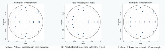 For the selection of the lag order, taking the eastern region as an example, the result shows that the best lag order of the PVAR model is 6; according to the same principle, the best lag order of the central region is 6, and the optimal lag order of the western region is 5. To make the empirical analysis of the three regions comparable, the optimal lag order of the western region is finally determined to be 6. Then, when the lag order is 6, there is Granger causality among the three variables in the eastern, central, and western regions at the 1% significance level; that is, economic policy uncertainty, enterprise investment behavior, and enterprise profitability interact, which provides the basis for the PVAR analysis below. In addition, as shown in Figure 5, the root modules of the PVAR models constructed for the three regions are all less than 1, and these models can be used for further model analysis, impulse response, and variance decomposition.