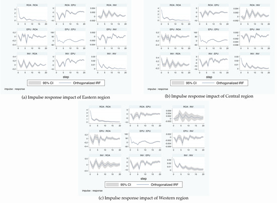 The three impulse response graphs of the eastern, central, and western regions show that for the impact of the ROA variable with a standard deviation, EPU immediately produces a negative impact. As shown in Figure 6, the point estimates of the eastern and western regions gradually tend to 0 starting from the sixth period, while those of the central region do not start to steadily trend to 0 until the tenth period. This shows that enterprise profitability has a negative impact on economic policy uncertainty; however, this impact is evident only in the first six periods, that is, one and a half years, for the eastern and western regions, which show that enterprise profitability can inhibit the production of economic policy uncertainty in the short term. In contrast, the central region has a longer-term inhibitory effect. For the impact of enterprise profitability, the response of corporate investment activity shows a positive effect, indicating that an increase in corporate profitability in the eastern, central, and western regions promotes corporate investment activity in the long term.