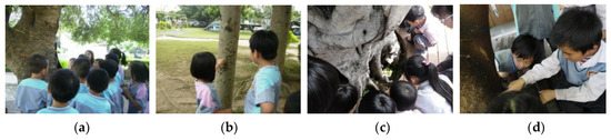 Students explore campus natural ecology: (a) Campus tour; (b) Knowing the plant; (c) Finding small animals; (d) Discovering small animals.