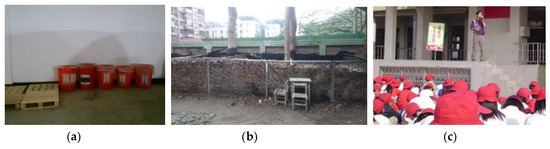 Waste Reduction Scope: The school has used the following methods or activities to achieve the goal of waste reduction, including the Monday’s Vegetable Day policy is promoted to reduce CO2; ordinary time is used to propagate the categories of daily necessities; resource recycling classification information is posted in the bulletin board; each class is equipped with resource recycling bins and trash cans; recycling bins are divided into containers (paper containers, plastic containers), paper and plastic for recycling; resources recycling work is executed at a fixed time every week; also to encourage recycling, waste batteries can be collected at the office to exchange for rewards; in addition, because there are a large number of fallen leaves and branches in the campus, a fixed collection location is set up to collect them in the campus and then, the district office collects and transports them to the mountain nearby for composting. Figure 3 shows the waste reduction methods used and an advocacy activity of waste batteries recycling.