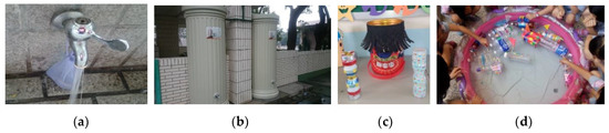 Health Scope: The textbook knowledge and daily life experience are combined for students to learn in this scope, such as: the windows are opened to ventilate when arriving at school in the morning; the lights are turned on in time according to the brightness of the classroom; some of the faucets in the handwashing sink are replaced with water-saving faucets to achieve the purpose of saving water from the hardware equipment; an empty bucket is put on the handwashing stand outside the middle and upper grade toilets to collect water for washing hands or things so that it can be used for cleaning the toilets in the afternoon; an empty bucket is put on the handwashing stand outside the lower grade toilets (in the first floor) to collect the water after washing the dust cloth so that it can be used to water onto the turf outside the flower garden; in addition, cooperating with learning content, empty bottles recovered from resources can be made into environmentally-friendly musical instruments or toys. Figure 4 shows resource saving or reuse.