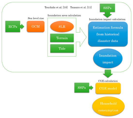 This paper proceeds as follows. Section 2 presents the methods and new features of Tsuchida et al. [10] and Tamura et al. [11], and our method for assessing the macroeconomic impact of SLR. The results in Section 3 and the discussion in Section 4 focus on changes in household consumption from business-as-usual scenarios, which do not consider the impact of SLR, as a welfare measure.
