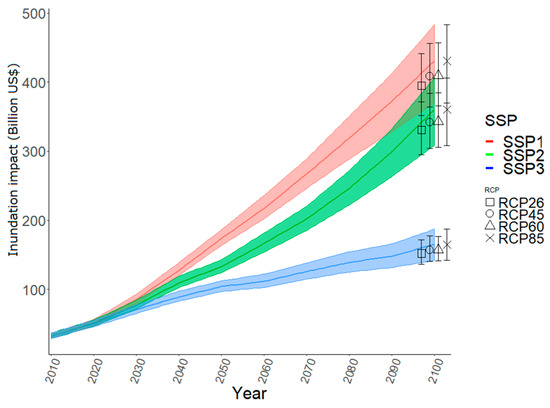 The cumulative inundation impact worldwide (billion US$). The lines show the average values of the results by four general circulation models and the ranges show the upper and lower limits of the results for these under representative concentration pathways (RCP) scenario number 8.5. The points show the average value and the error bars show the upper and lower limits in 2100 under each RCP scenario.