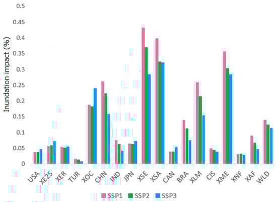 Their results are shown in Figure 2 and Figure 3. Figure 2 shows the cumulative inundation impact worldwide. The inundation impacts are large in SSP1 and small in SSP3. Figure 3 shows the inundation impacts per GDP by country in the year 2100 under RCP8.5 and under the three SSP scenarios. The developing regions XSA, XSE, XME, CHN, XOC, and XLM show relatively large inundation impacts.