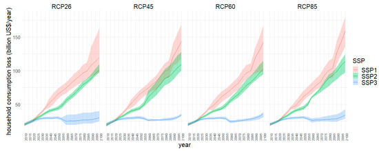 Annual household consumption loss worldwide (billion US$/year). The lines show the average value of the results by four general circulation models. The ranges show the upper and lower limits of results for these.