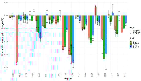 The percentage of household consumption change in 2100 in each region and worldwide (%). The bar shows the average value under representative concentration pathways (RCPs) scenario number 8.5 and the point shows the average value under each RCP scenario.