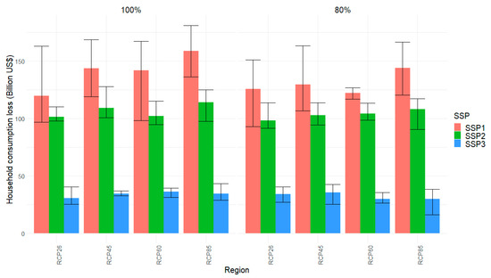 The right side in Figure 6 shows the result when 80% of the inundation impact is introduced to the CGE model as a capital loss. In this analysis, the response varies from scenario to scenario. Under some scenarios, the household consumption loss increased despite the decreased capital loss, however, the trend among SSP scenarios is consistent under all RCP scenarios. Under SSP1, the difference in household consumption loss between RCP2.6 and RCP8.5 is $18 billion (0.0077%). Under SSP2 and SSP3, the differences are $10 billion (0.0042%) and $4 billion (0.0035%), respectively. This result shows that the socioeconomic assumptions affect the household consumption loss and the impact of climate change mitigation when the inundation impact is reduced by 20%; the effects have the same trends as under the main scenario.