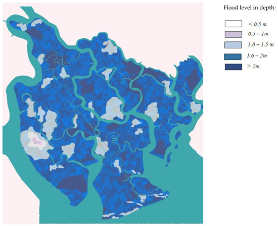 Table 1). At the same time, the average temperature in the city is expected to increase by 1 °C in 2050 and by 2.6 °C in 2100. By 2050, most districts in the city will be at risk of flooding, including the places that have not been flooded before. Of the city wards and communes, 177/322 will be subject to frequent flooding, which account for more than 123,000 ha (61% of the city area). Significantly, the depth of flooding will increase from 21% to 40%, and the duration of flooding will be extended mainly in Can Gio, Binh Chanh, and Nha Be districts.