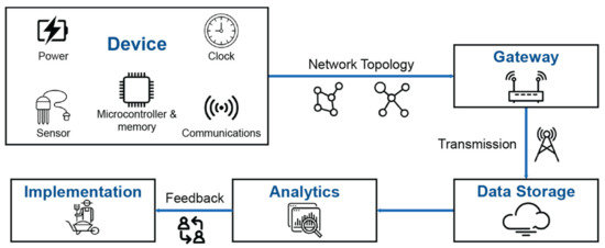 A typical IoT for agriculture system consists of the following: (i) measurement device, (ii) data transmission, (iii) data storage and analytics, (iv) feedback and implementation, and (v) project structure and support (Figure 1). The device layer consists of a sensor to measure the parameter of interest (e.g., soil moisture) and the electronics necessary to support its functions. Devices are arranged in a topology and connected to a gateway using a communication protocol in the data transmission layer. Broad coverage of cellular networks allows for frequent, and in some cases near real-time, data transmission. Individual or aggregated measurements are received by a server where they can be queried, cleaned, and analyzed. Relevant insights are fed back to an end-user or other IoT devices to inform decisions and prompt actions. A vast catalog of existing products and services that are tailored for specific applications make each of these operations increasingly easier and provide a lower cost to implement. More detailed introductions to IoT architecture design and theory can be found in [18,19]. This review primarily focuses on categories (i) and (ii), accompanied by discussion of the implications on (v).