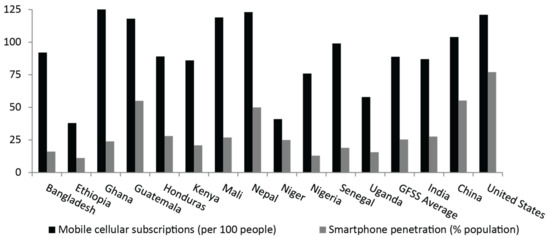 Mobile phone subscriptions and smartphone penetration across the global food security strategy (GFSS) country set, India, China, and the United States [23,24].