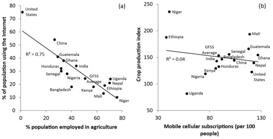 An important enabler for IoT services in LMICs (and a sub-set of LMICs—global food security strategy (GFSS) countries [20]) is reliable cellular infrastructure [21]. Country level data from the World Bank suggests that the GFSS country set average for cellular connections and smartphone penetration is on par with India, a common benchmark for digital services among developing countries (Figure 2). However, the linkage has not yet been made to the agricultural sector. Internet usage in GFSS countries ranges from 10%–50% of the population and correlates inversely with the population employed in agriculture (Figure 3a). Where access to internet falls short, digital services often benefit from cellular connectivity. However, while agricultural productivity has increased in most GFSS countries, those gains show no correlation with mobile phone penetration (Figure 3b). For example, a recent study has shown that mobile phone ownership in farming households is nearly universal; however, fewer than 25% use a phone to access information about agriculture and livestock, or for buying and selling products [22]. These data, and more from the GFSS agriculture dataset, can be accessed in the Supplementary Materials.
