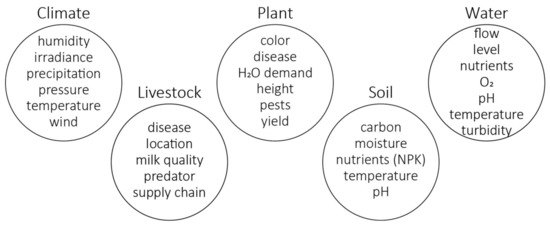 For this overview of IoT for agriculture, sensor and communication technology applications are classified into five categories of (a) climate, (b) livestock, (c) plant, (d) soil, and (e) water. Within each category, there are many common, measurable parameters that can influence the performance of the agricultural system (Figure 4). This categorization focuses on “ground-based” measurements, while other methods exist including aerial- and space-based earth observation or remote sensing, for example in [26,28]. In some cases, remote sensing and ground-based measurements are combined to provide temporally (ground-based sensors) and spatially (remote sensing) dense crop measurements [29].