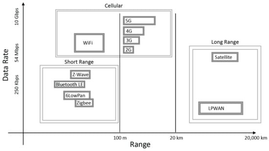 In Figure 5, communication protocols are grouped based on data rate and range of transmission, which is divided into “Long range”, including low-power wide area network (LPWAN), which includes LoRa and SigFox, “Short range”, including Bluetooth Low Energy (BLE), Zigbee, and Z-Wave, and cellular communication including GSM 2G, 3G, 4G, and 5G. With respect to power consumption, solutions that are tailored to IoT applications offer superior performance to more general protocols (Figure 6). While the range and power consumption of protocols like LoRa and SigFox are well suited for IoT applications, their device compatibility is more limited compared to generic wireless protocols like Bluetooth and WiFi. Additionally, cellular and satellite communication offer the advantage of providing a direct link to a web server instead of passing through an intermediate gateway.
