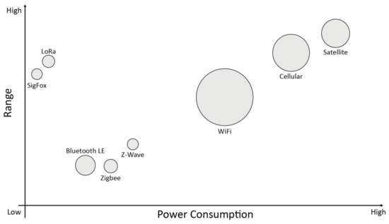 Power consumption vs. range for common communication protocols [81,82]. Bubble size is proportional to data rate.